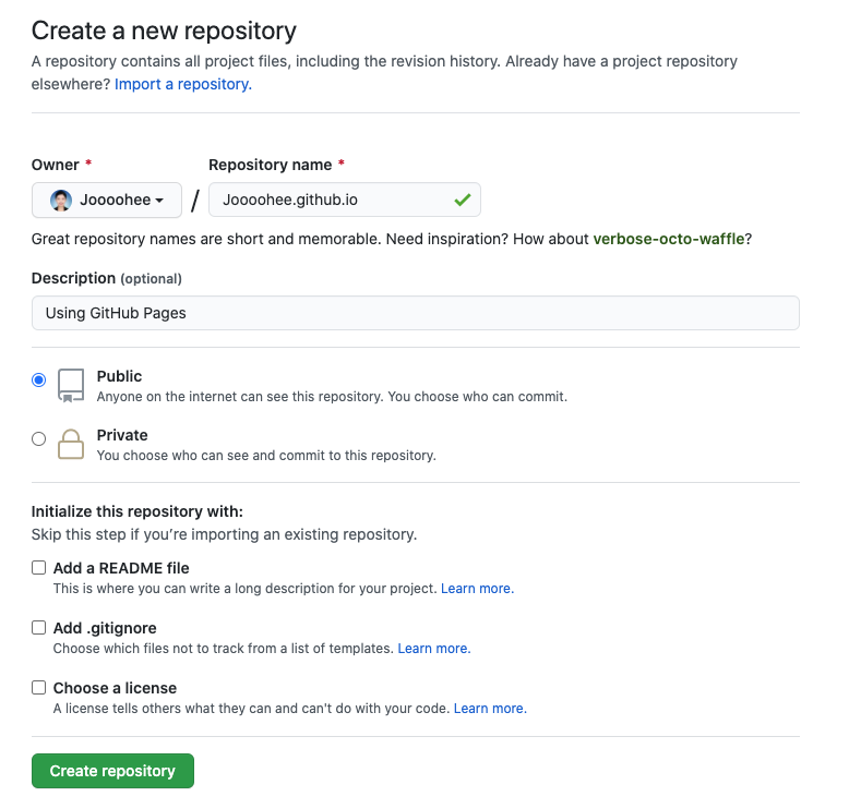 Repository 이름이 [username].github.io인 새로운 Repository를 생성한다.