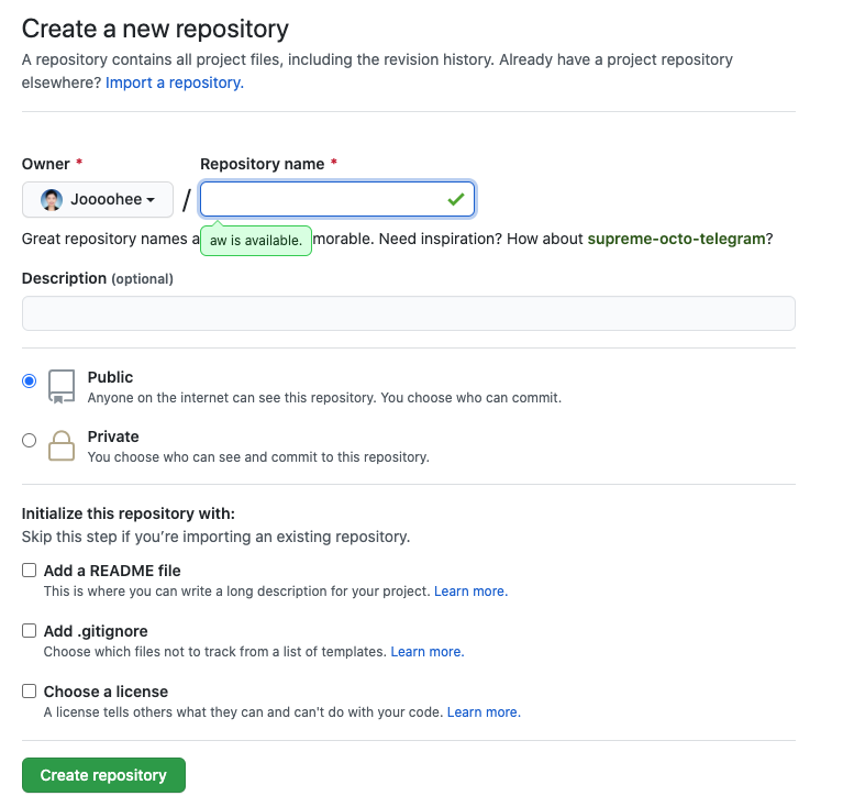 Public Repository로 해야 호스팅 이용이 가능하다.
