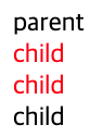 <html> <div class="parent">parent <div class="child">child</div> <div class="child">child</div> <div> <div class="child">child</div> <div> </div> </html>자식 결합자이므로 parent 클래스 바로 아래에 있는 2개의 child 클래스만 선택된다.