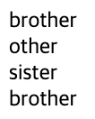 <html> <div class="brother">brother</div> <div class="other">other</div> <div class="sister"> sister </div> <div class="brother">brother</div> </html>brother 클래스 바로 뒤에 other 클래스가 위치하고 있으므로, 아무도 선택되지 않는다.